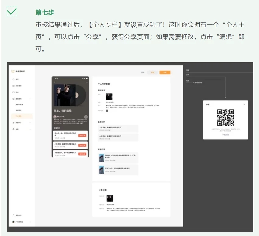 首先登錄視頻號(hào)助手,點(diǎn)擊直播管理,進(jìn)入個(gè)人專欄,點(diǎn)擊右側(cè)“創(chuàng)建”按鈕。在“個(gè)人專欄配置”中,選擇合適自己的直播分類,填寫完專欄主題和簡介,并選擇是否添加直播預(yù)告和設(shè)置直播回放。然后在“分享配置”中確認(rèn)分享至微信群和在直播中的效果,點(diǎn)擊“提交”。最后只需要等待平臺(tái)審核直播欄目內(nèi)容即可。審核通過后,創(chuàng)作者的“個(gè)人主頁”就建立好了。點(diǎn)擊“分享”獲得分享頁面,如果需要修改,點(diǎn)擊“編輯”即可。