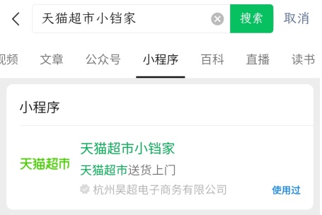 近日,淘寶天貓在微信上線了一款“天貓超市小鐺家“小程序,賬戶頭像使用了天貓超市l(wèi)ogo。