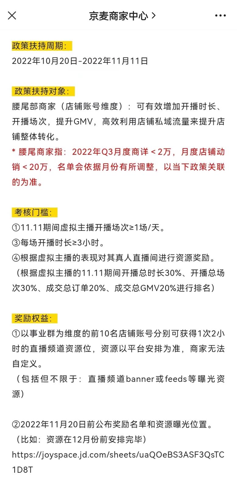 11月2日消息,京麥商家中心發(fā)布2022年11.11虛擬主播扶持政策。此次政策扶持周期是2022年10月20日-2022年11月11日。