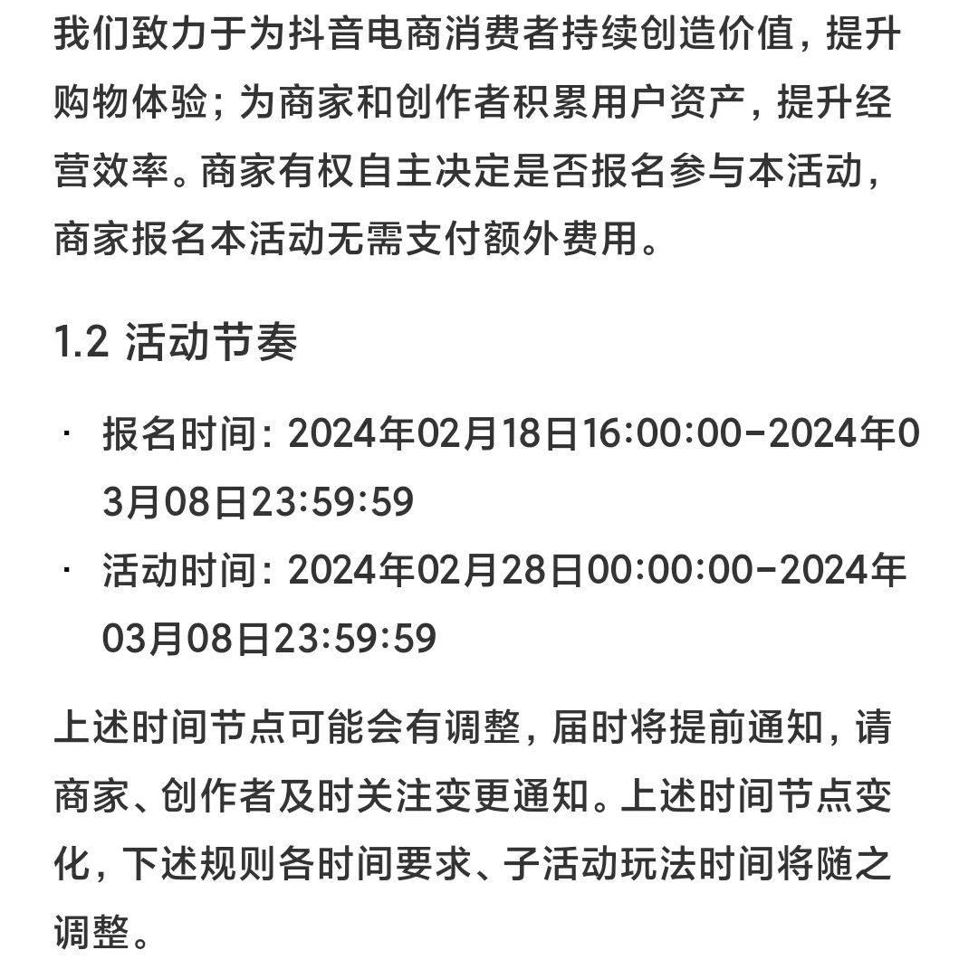 本次抖音商城38好物節(jié),商家報(bào)名時(shí)間為2月18日16點(diǎn)至3月8日24點(diǎn),活動(dòng)時(shí)間是2月28日0點(diǎn)開(kāi)啟,3月8日24點(diǎn)結(jié)束?;顒?dòng)期間,平臺(tái)主要玩法是官方立減、大促直降,直播間的玩法是超值天團(tuán)直播間(面向平臺(tái)達(dá)人作者)和超值品類直播間(面向行業(yè)垂類達(dá)人)。